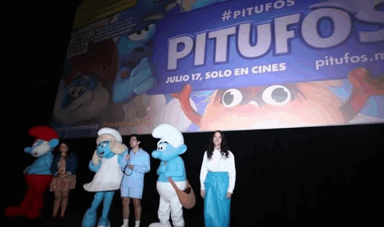 Entraron a una sala de cine repleta, al sur de la CDMX, para destacar que trabajaron en la cinta Pitufos, dirigida por Matt Landon y Christopher Miller, con la intención de inspirar a los pequeños a través de su mensaje.